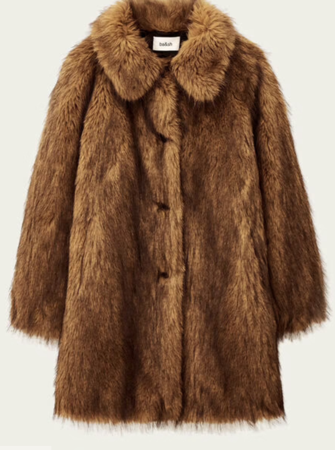 ABRIGO BA&SH – Volumen pequeño – Estilo setentero – Cuello redondo – Botonadura central delantera – Corte recto – Largo hasta medio muslo Hecho en China Materiales: 100% POLIÉSTER