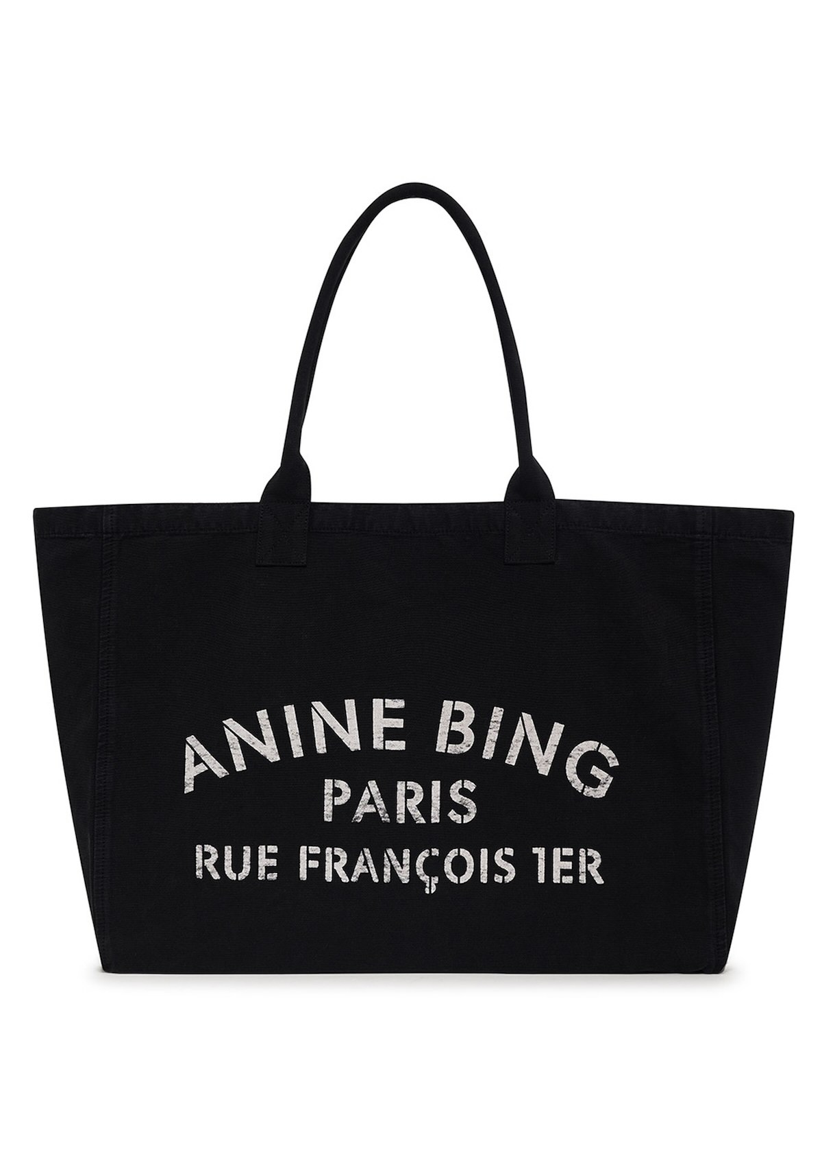 BOLSO ANINE BING   Un bolso tote de lona sin forro en negro por todas partes y la marca ANINE BING serigrafiada en blanco en contraste.  Medidas del producto: Alto: 46 cm, Ancho: 49 cm   100% algodón