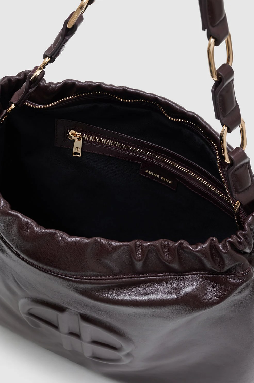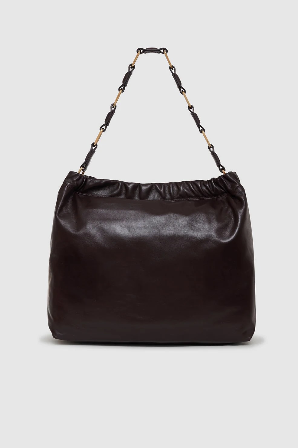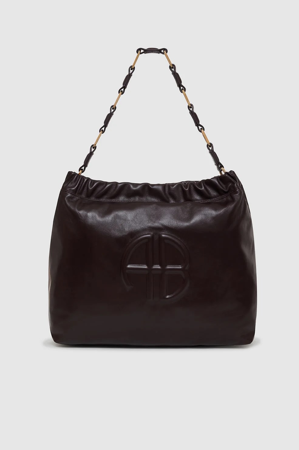 BOLSO ANINE BING   Inspirado en el icónico bolso Kate Tote, el bolso de hombro Kate está confeccionado en suave piel de cordero 100 % en negro con un ligero brillo. Esta icónica silueta luce una correa de eslabones entrelazados con detalles dorados. Su nostálgica construcción incluye una abertura elástica fruncida y un cierre de cremallera superior que revela un interior de sarga de algodón completamente forrado con un bolsillo deslizante y otro con cremallera. Luce un monograma ANINE BING grabado en relieve en la parte delantera.  Medidas del producto: Alto: 24 cm, Ancho: 42 cm     100% piel de cordero