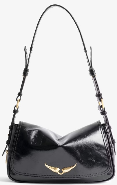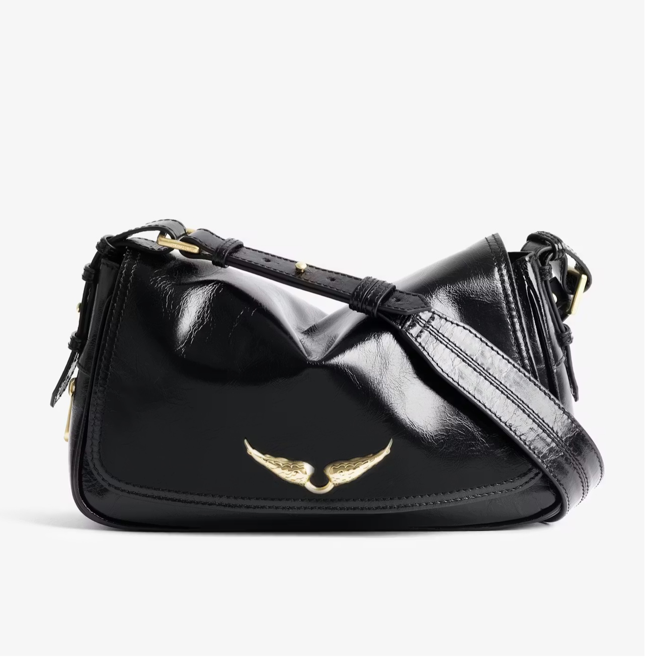 Pequeño bolso de cuero charol efecto vintage, con bandolera ajustable y alas distintivas.