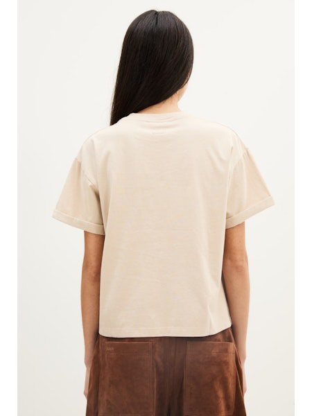 Un gran clásico de nuestro armario, la camiseta ROSIE tiene un corte recto impecable con mucho espacio para dejar espacio de movimiento. Las sisas son caídas, el cuello redondo es amplio, las mangas cortas son amplias y rematadas con un pequeño puño. Confeccionada en algodón muy suave, deja ver dos costuras perpendiculares en la espalda en un estilo gráfico que tanto nos gusta. Mételo en una falda entallada para un efecto chic y poco convencional.