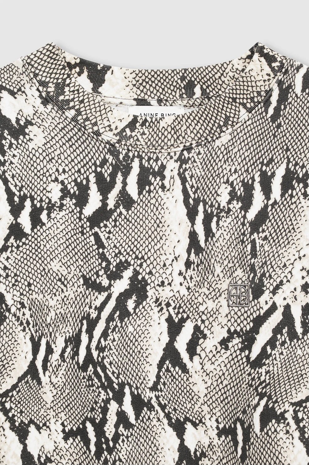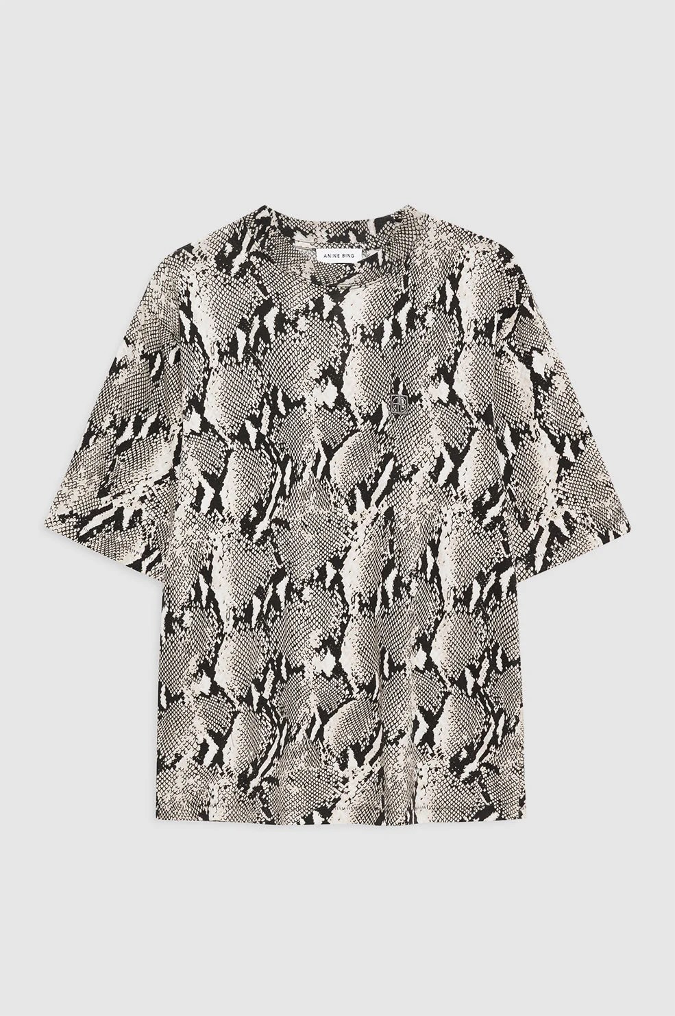 Camiseta oversize de corte cuadrado, confeccionada en jersey ligero 100 % algodón con estampado integral de pitón lavado. – Jersey de algodón – Corte oversize – Monograma gris ANINE BING enmarcado, bordado en el lado izquierdo del pecho. Nota: Esta prenda está hecha a mano individualmente y su color o apariencia pueden variar. Corte holgado y ligeramente más largo: Elige tu talla real. La modelo lleva una talla S. Medidas de la modelo: Altura: 176 cm, Busto: 81 cm, Cintura: 62 cm, Cadera: 83,8 cm Medidas del producto (Talla S): Largo: 65,41 cm, Busto: 50,8 cm, Largo de manga: 26,98 cm