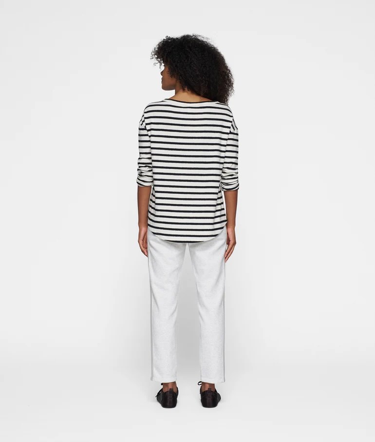 CAMISETA 10 DAYS Camiseta de manga larga a rayas de corte holgado, confeccionada en algodón orgánico con certificación GOTS. Presenta un bajo redondeado más largo en la espalda que en la delantera, una inserción de hombros bajos, un ribete 10DAYS en la costura lateral izquierda y un monograma "10" bordado en la manga izquierda. Material 100% algodón orgánico