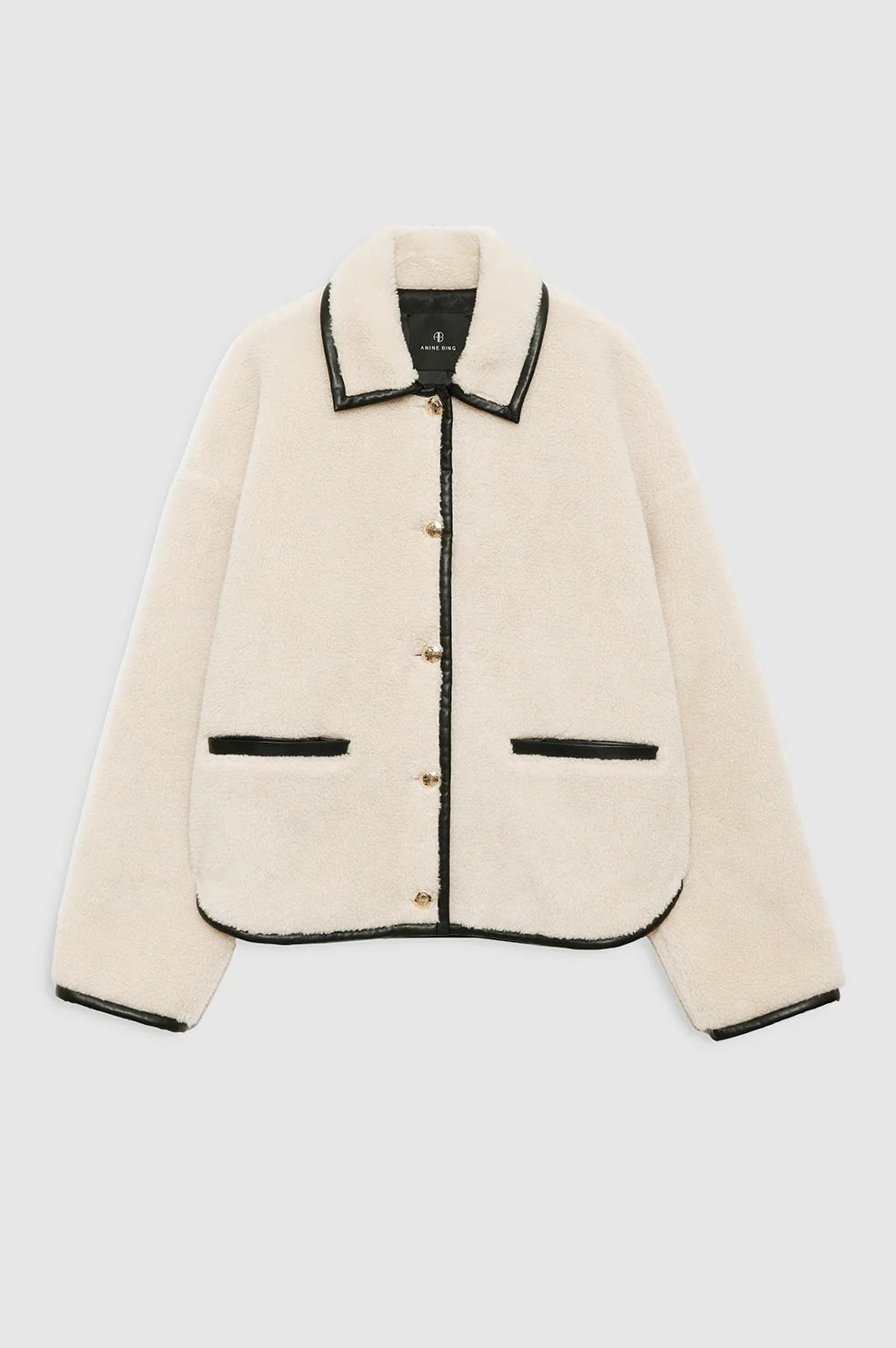 Chaqueta de inspiración utilitaria confeccionada en mezcla de lana con acabado color crema. – Mezcla de lana – Totalmente forrada – Corte cropped y cuadrado – Sisas caídas – Ribete de piel sintética – Dos bolsillos laterales en las caderas La modelo lleva la talla S. Medidas de la modelo: Altura: 175 cm, Contorno de pecho: 76 cm, Cintura: 58,5 cm, Cadera: 86,4 cm Medidas del producto (talla S): Largo: 63,5 cm, Contorno de pecho: 119,38 cm, Largo de manga (desde el centro de la espalda): 83,82 cm 87% poliéster, 8% acrílico, 5% lana Lavar a máquina por separado