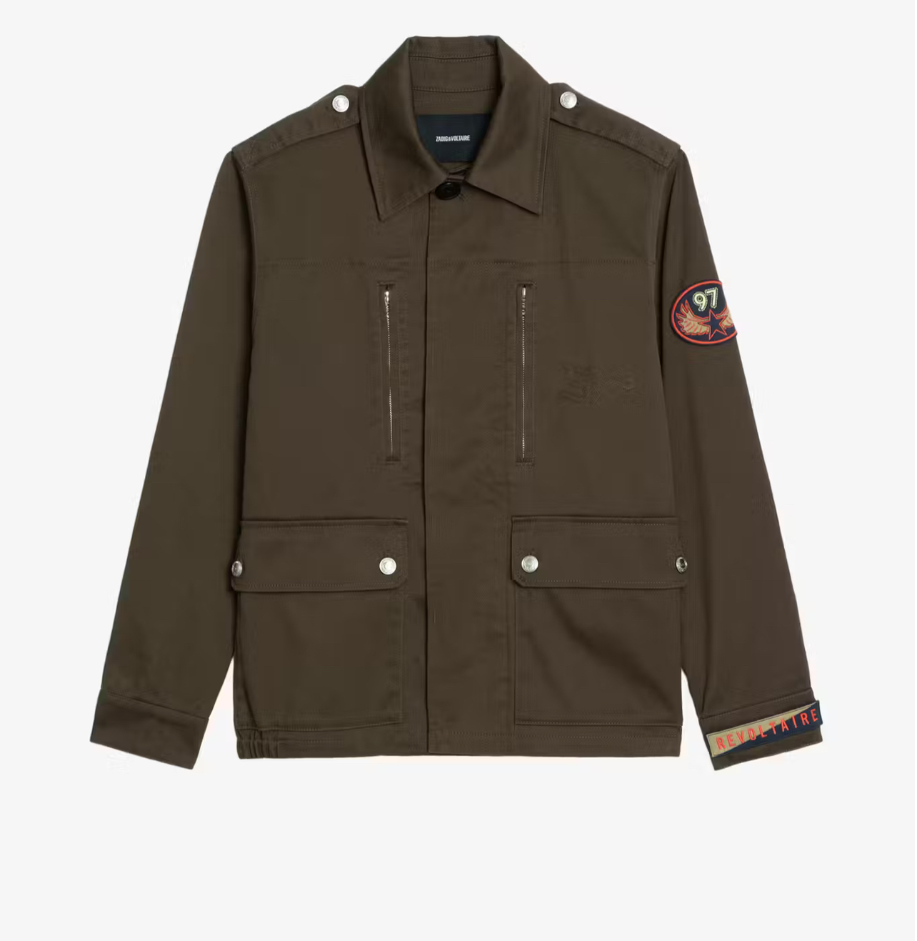 Chaqueta militar con cierre de botones y bolsillos funcionales.