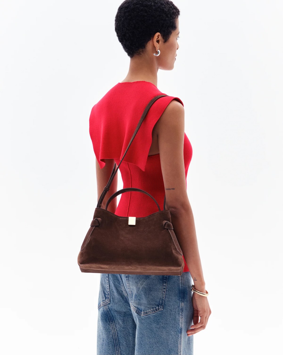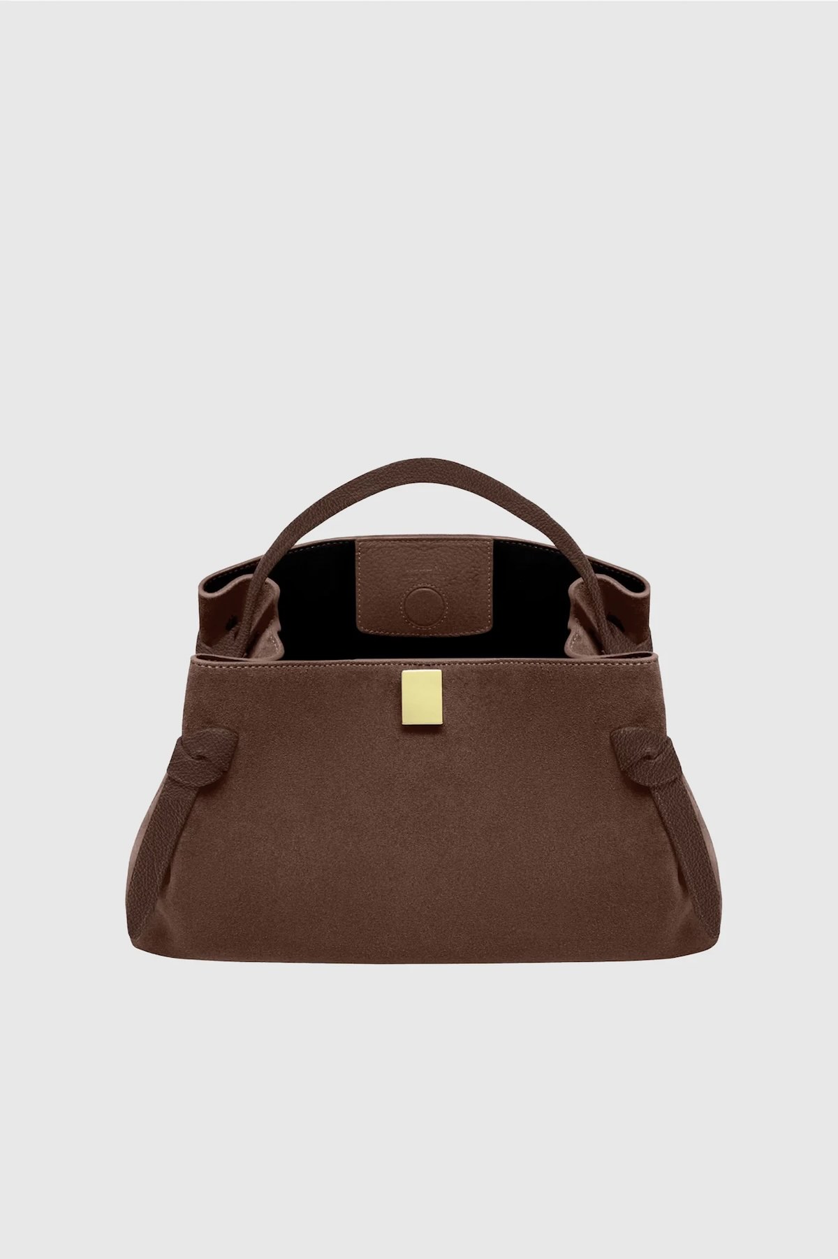 El Gyoza es un bolso de asa superior, elaborado en lujosa gamuza italiana color chocolate y adornado con elegantes herrajes dorados. Hecho a mano con estándares de lujo por artesanos en España. Capacidad para guardar objetos esenciales de uso diario: teléfono, llaves, lápiz labial. Bandolera ajustable y extraíble. Cierre de imán. Herrajes dorados. 100 % piel bovina. Forrado en 50 % poliamida, 50 % poliuretano. Dimensiones: Ancho superior: 23 cm. Ancho inferior: 32 cm. Profundidad: 11 cm. Altura sin asa: 18,5 cm.