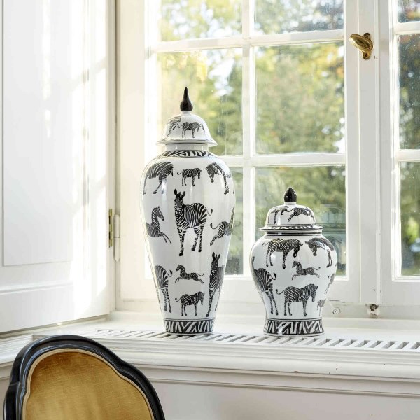 Jarrón con tapa de porcelana con diseño de cebras en blanco y negro para decorar cualquier estancia de tu hogar.MEDIDAS:21x21x34. Disponible en un tamaño superior.