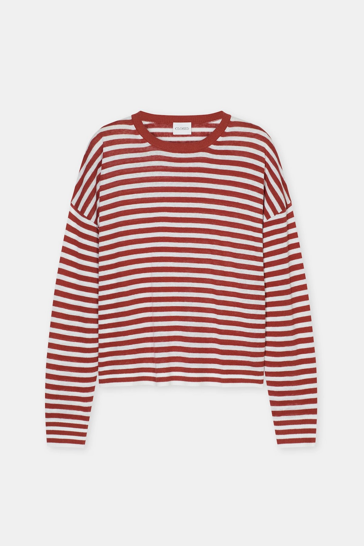 Jersey de rayas de lino y algodón. Este suéter de punto, confeccionado con una mezcla de lino y algodón de alta calidad, destaca por su estampado de rayas y su silueta moderna y holgada. El cuello redondo, las mangas largas y el largo clásico lo convierten en una prenda elegante.