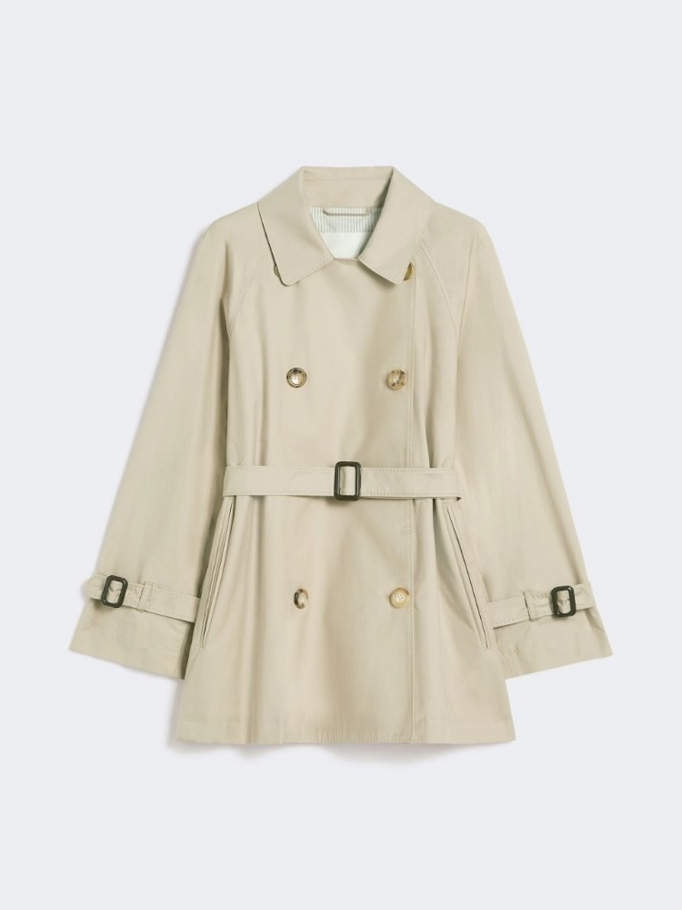 Gabardina corta con cierre cruzado de doble botón, acabada con capa en la espalda, costuras de punto sartorial y cinturón a juego con hebilla de piel y logotipo Max Mara en relieve.