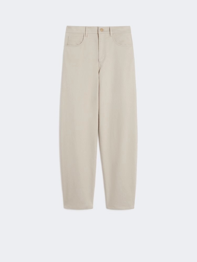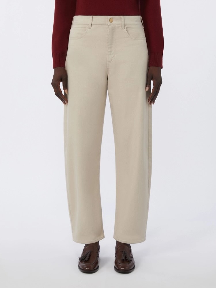 Pantalones de cinco bolsillos, caracterizados por una silueta de pernera barril.
