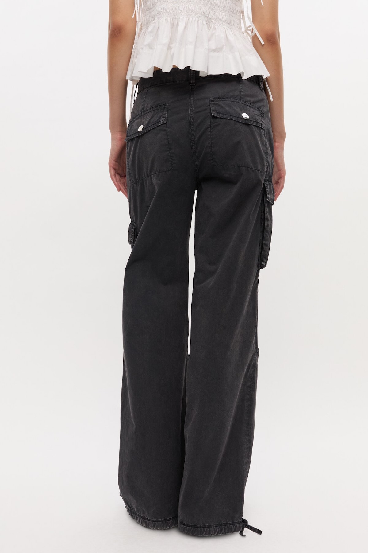 Estos pantalones cuentan con trabillas para cinturón, cierre de cremallera y botón, un pequeño bolsillo frontal, dos bolsillos cargo laterales, bolsillos traseros y cordón en los tobillos.