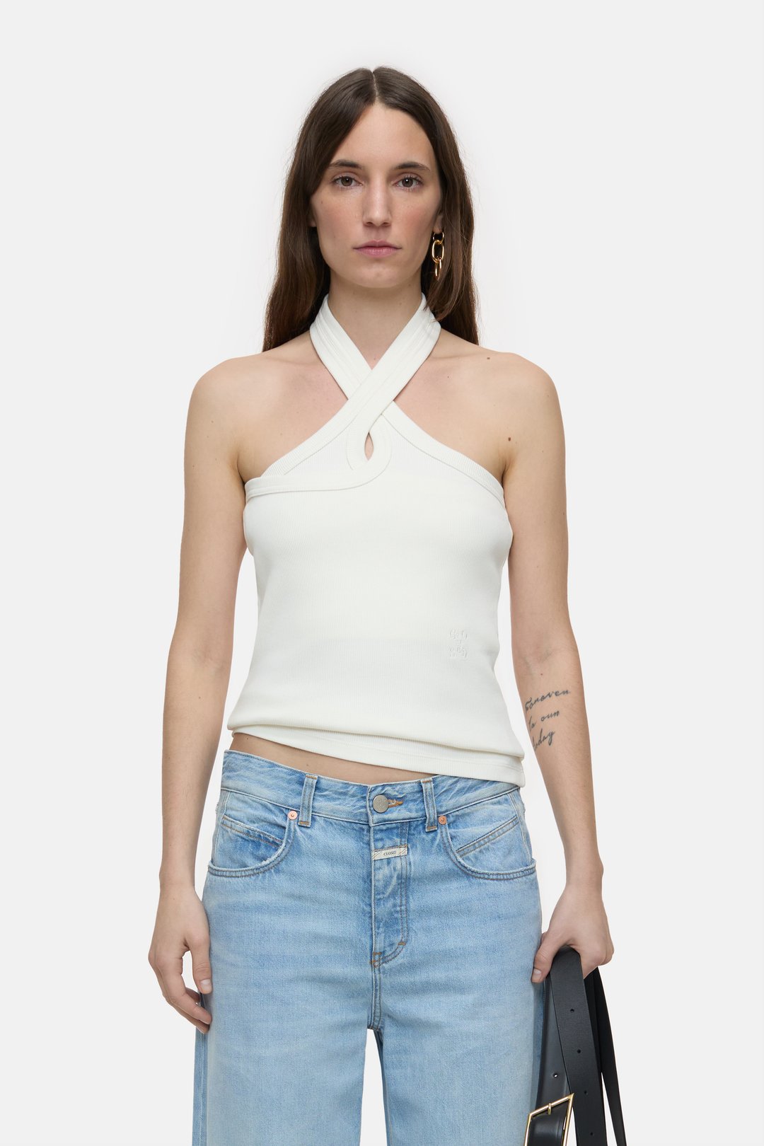 TOP CLOSED. Top con cuello halter. La camiseta de canalé con corte entallado está confeccionada en puro algodón orgánico con un porcentaje elástico. El detalle cruzado del cuello halter deja al descubierto la parte superior de la espalda. Con un delicado logo bordado y bajo recto. Ajustado. Hecho en Turquia. Material y cuidado: 95% algodón (orgánico), 5% elastano