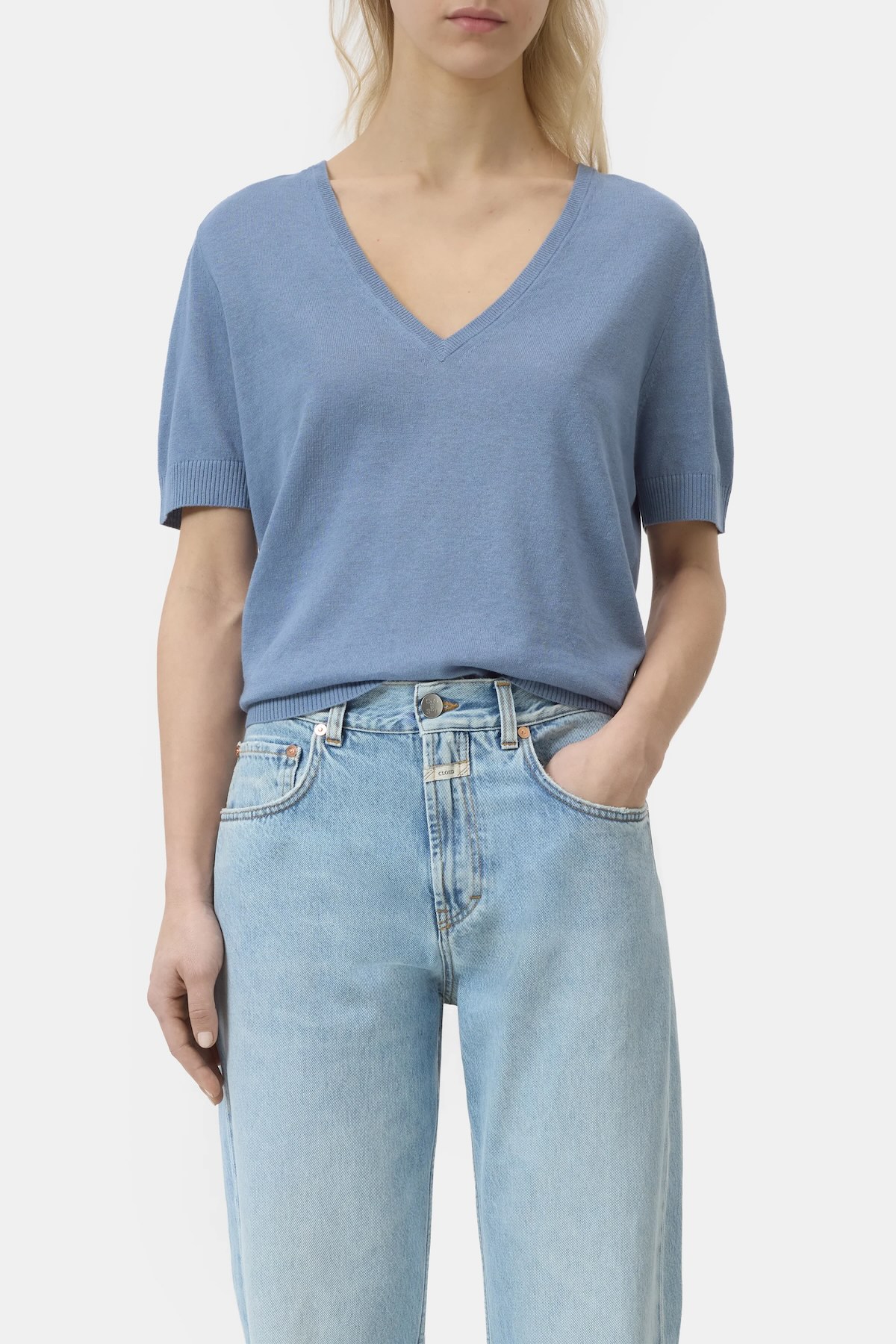 - Top ligero de manga corta de alta calidad, confeccionado en un fino tejido de punto veraniego (14 g). Tejido con una suave mezcla de lino y algodón. Presenta un corte clásico con escote en V pronunciado y puños y bajo acanalados. Ajuste regular
