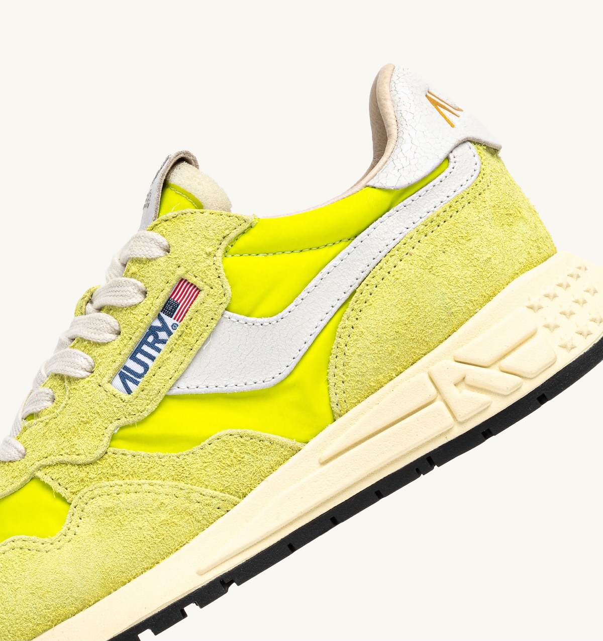 - Las zapatillas Reelwind combinan el característico estilo de Autry con elementos inspirados en el mundo del running. Definidas por una silueta elegante y un diseño retro de los años 80, ofrecen ligereza, flexibilidad y un agarre óptimo. El modelo para mujer está fabricado en una mezcla de ante y nailon amarillo fluorescente con una aplicación en los laterales de piel craquelada blanca.